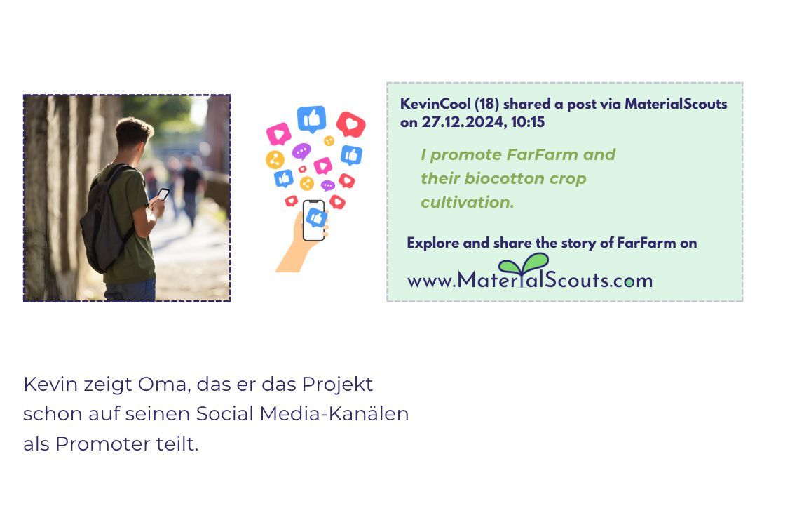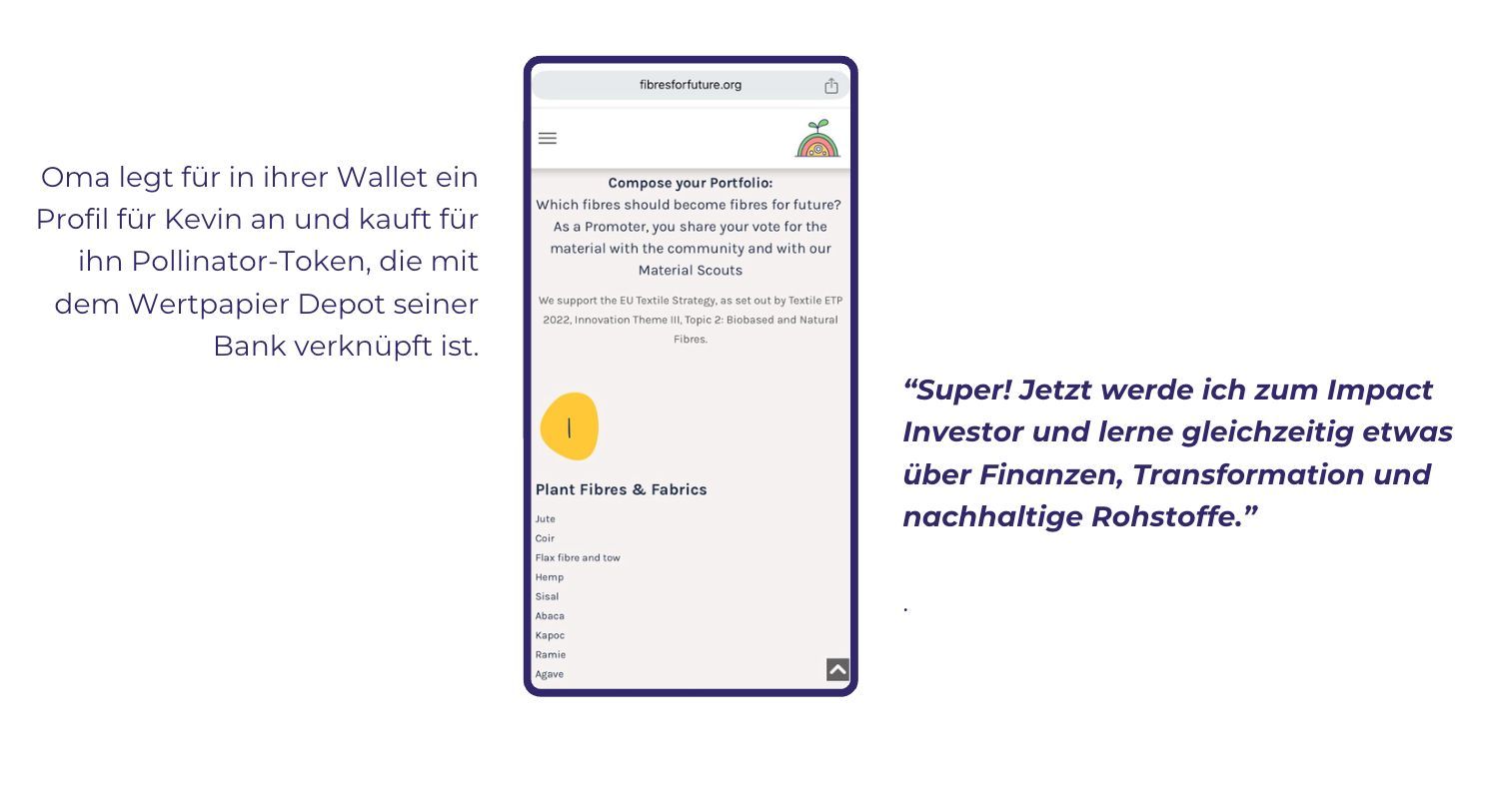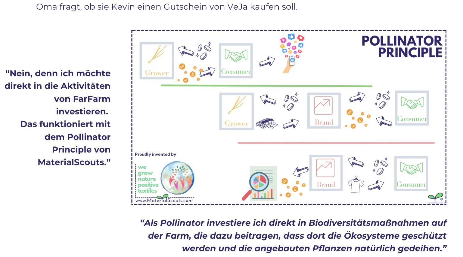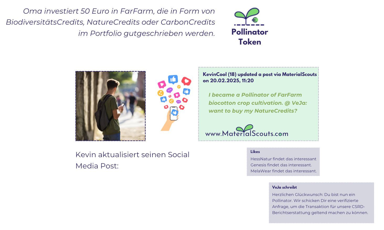 Der Pollinator-Token finanziert die Biodiversitätsmaßnahmen auf dem Feld. Über Social Media aktiviert der Käufer potenzielle Abnehmer, Nachahmer und -ganz wichtig- die Textilindustrie und den Modehandel.